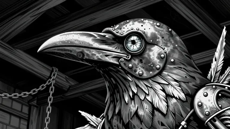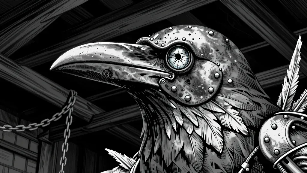A steampunk-inspired clockwork raven with polished metal and rough feathers perches on a wooden perch, illuminated by dim ambient light that highlights the metallic surfaces and creates shadowed areas. The composition focuses on the raven's head and upper body, with a blurred background of mechanical components and wooden planks.