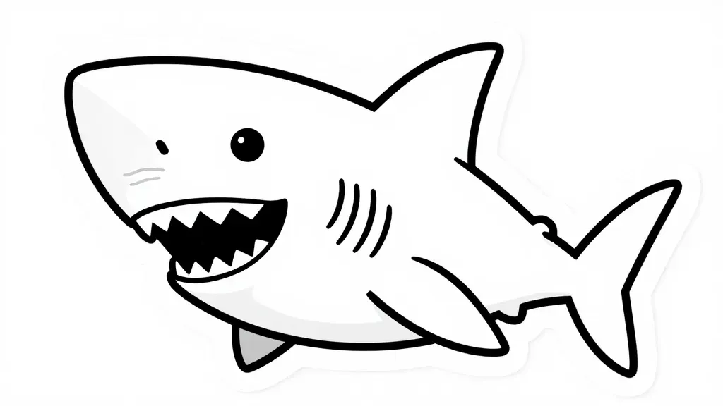 A hand-drawn cartoon shark lies on its side with its mouth open, illuminated by top-down lighting that creates soft shadows and highlights. The minimal white background provides ample copy space for design integration.