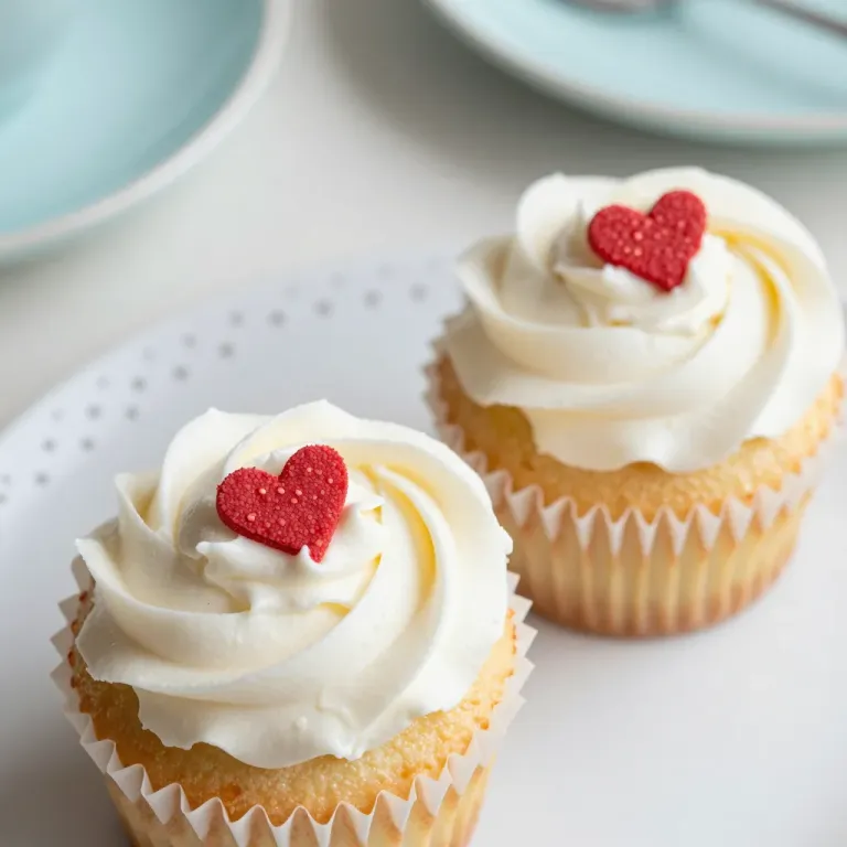 Close-up of vanilla cupcakes topped with smooth white frosting and red heart decorations, illuminated by soft, diffused natural light that highlights the texture and color. The shallow depth of field and blurred background of light blue plates suggest a setting for a special occasion.