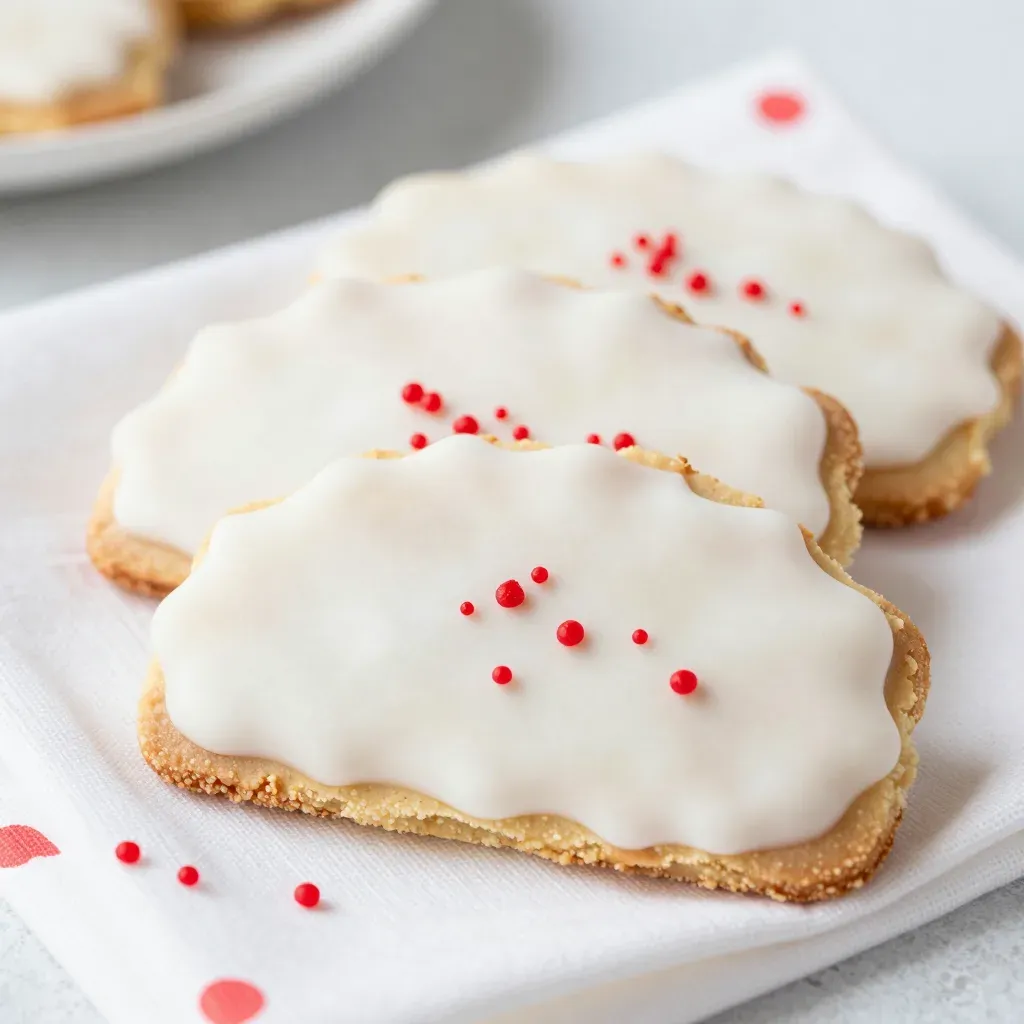 Three almond-iced slices with glossy white icing and tiny red sprinkles are arranged diagonally on a crisp white napkin, showcasing a crumbly golden-brown cookie base. Soft, diffused lighting from the upper left creates gentle highlights on the icing and shallow depth of field emphasizes the foreground cookie while blurring the background elements.