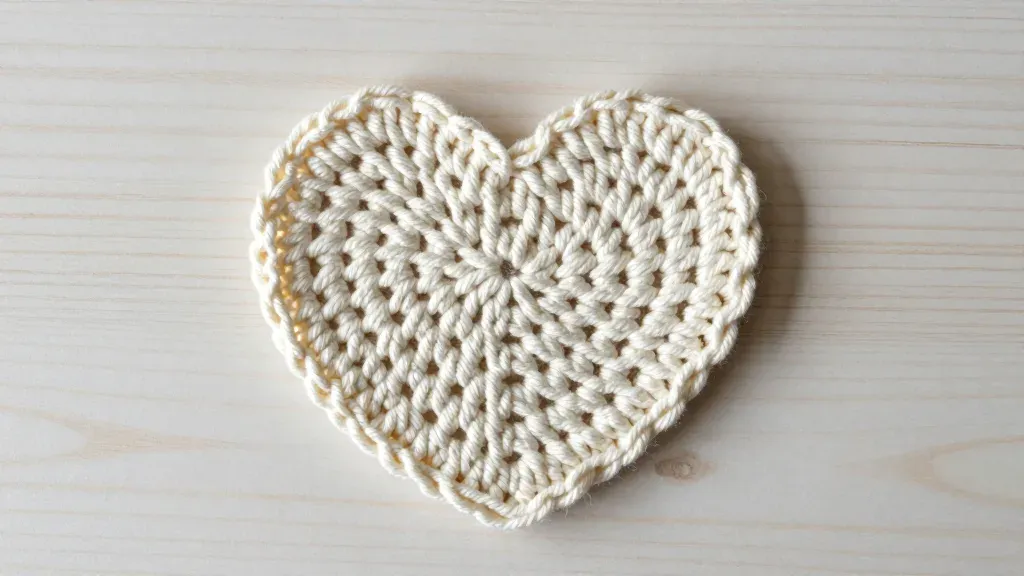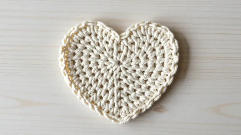 A delicate, handcrafted crochet heart-shaped coaster in creamy white yarn, showcasing intricate loops and a soft texture under diffused natural light. The light wooden background and shallow depth of field emphasize the coaster's detailed craftsmanship and create a serene, minimalist aesthetic.