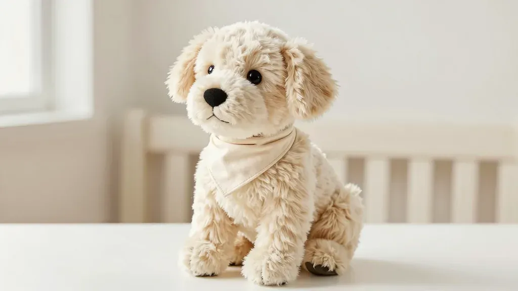 A soft, fluffy plush puppy with round eyes and floppy ears sits on a white bench, bathed in diffused light from a window, creating a warm and inviting ambiance. The clean and minimalist setting with a blurred background provides ample copy space for design elements.
