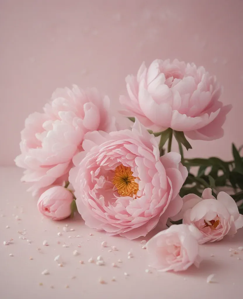 A bouquet of soft pink peonies with delicate, velvety petals, bathed in soft, diffused light from above, creating gentle shadows. The pale pink background provides a harmonious backdrop, enhancing the subject's ethereal beauty and creating a serene, romantic atmosphere.