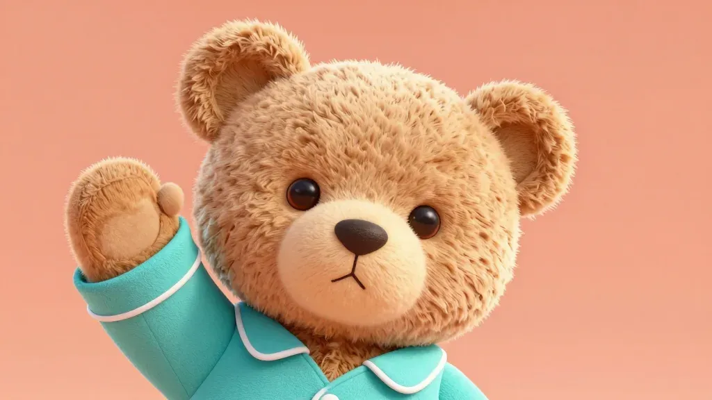 A soft, fuzzy teddy bear nestled in a cool turquoise blanket, illuminated by soft, diffused lighting that highlights its features and the blanket's texture. The blurred peach background provides a warm and neutral backdrop, creating a cozy and inviting atmosphere.
