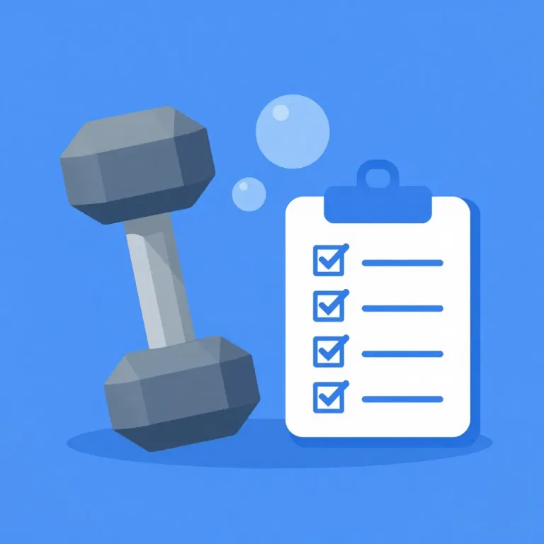 A glossy metal dumbbell rests in the foreground, its reflection shimmering, while a clipboard with blue checkmarks is slightly angled in the background, creating a balanced composition. The soft, diffused light from above highlights the textures and shadows, emphasizing the subjects against a minimalistic, slightly blurred blue background.