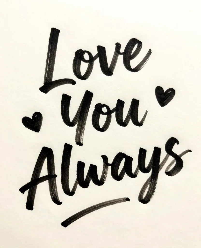 A heartfelt message 'Love You Always' written in black ink on off-white paper, adorned with two small hearts, under soft, diffused lighting that enhances the texture and warmth of the composition. The plain background ensures the focus remains on the emotional message and artistic detail.