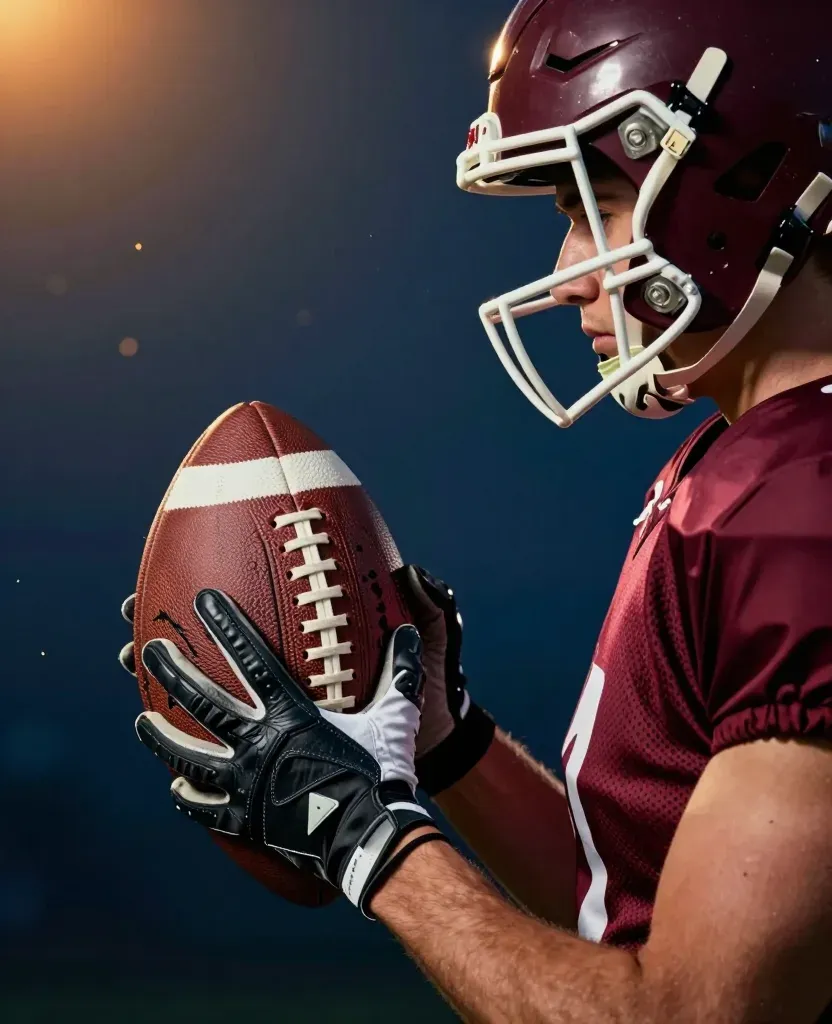 A football player in a maroon uniform prepares to catch a football, illuminated by stadium lights against a blurred background of crowd and lights. The close-up highlights the glossy helmet, textured football, and smooth gloves, creating a dynamic and focused composition.