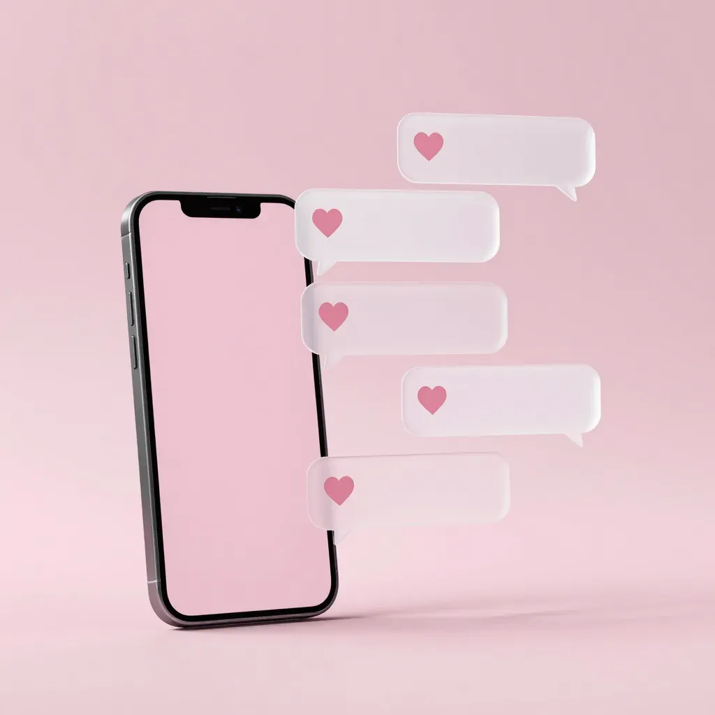 A sleek smartphone displays a series of floating heart symbols, creating a soft and ethereal visual effect. The diffused lighting highlights the hearts, adding depth and a gentle glow to the minimalist pastel pink background.