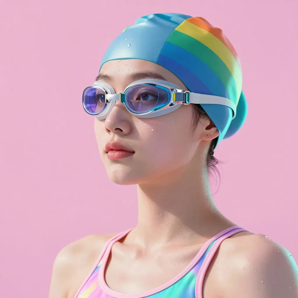 A swimmer in a vibrant rainbow swim cap and goggles stands against a soft pink backdrop, with water droplets glistening on their skin. The diffused lighting highlights the reflective surfaces of the swim cap and goggles, creating a clean and focused composition.
