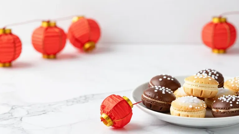 A plate of golden macarons with glossy chocolate ganache and white sugar sprinkles, set against a soft, warm light that highlights the textures and colors. The white marble countertop and red paper lanterns in the background create a clean and festive setting with a shallow depth of field.