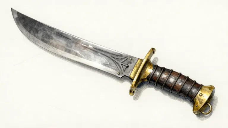 A close-up of a Hooked-Pirate-Cutlass with a polished brass hilt and intricate engravings, set against a clean white background, highlighting the blade's fine engravings and the warm glow of soft, diffused lighting.