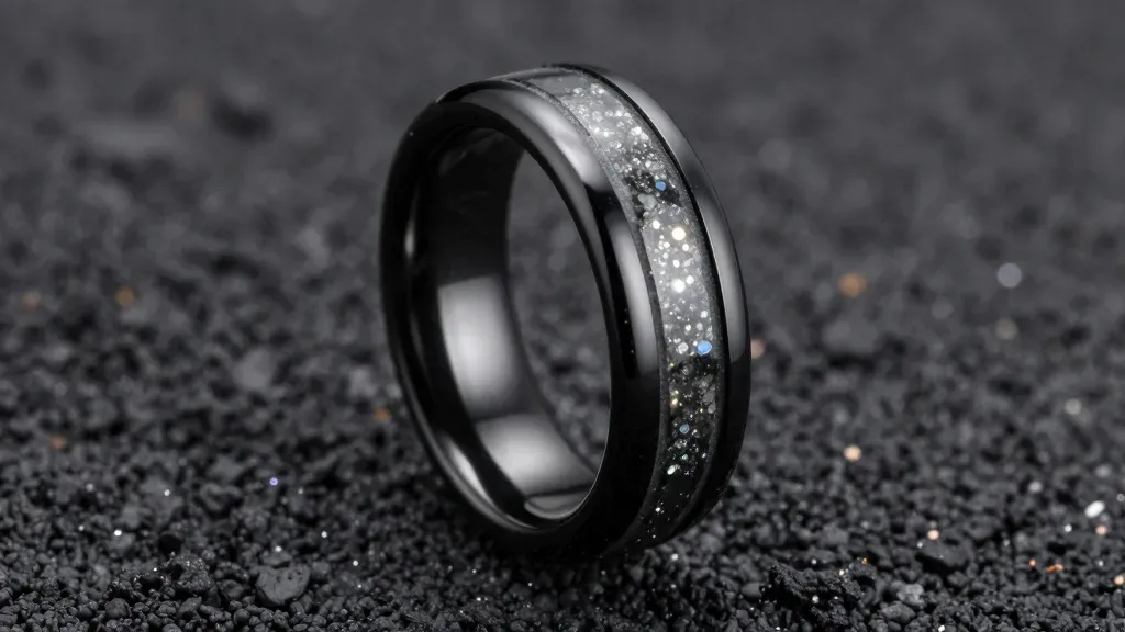 A sleek black ceramic ring with embedded diamonds rests on a coarse granular surface, its high-gloss finish reflecting soft side-lighting that accentuates the curvature and sparkle of the stones. The shallow depth of field isolates the ring against a blurred dark background, emphasizing its profile and creating a clean, focused composition.