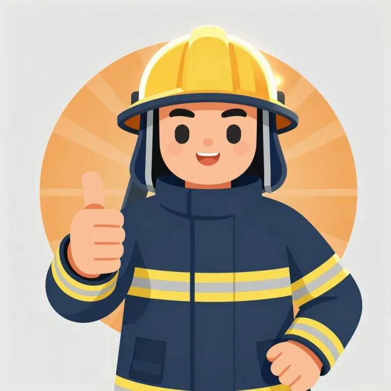 A cheerful cartoon firefighter in full gear, including a yellow helmet and navy jacket with reflective stripes, gives a thumbs-up gesture with a warm smile. The subject is framed by a soft golden-orange circular background with diffused backlighting creating a halo effect, providing a clean, focused composition with no environmental distractions.
