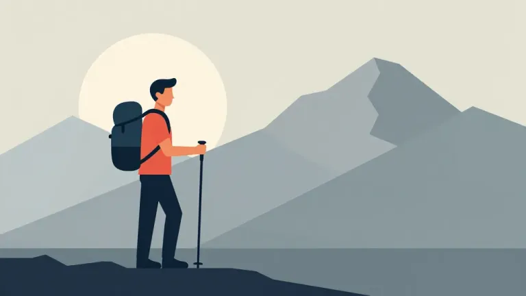 A hiker pauses on a rocky outcrop, facing away, with a backpack and trekking poles, bathed in warm sunlight. The composition emphasizes depth with a blurred mountain range in the background, creating a sense of solitude and adventure.