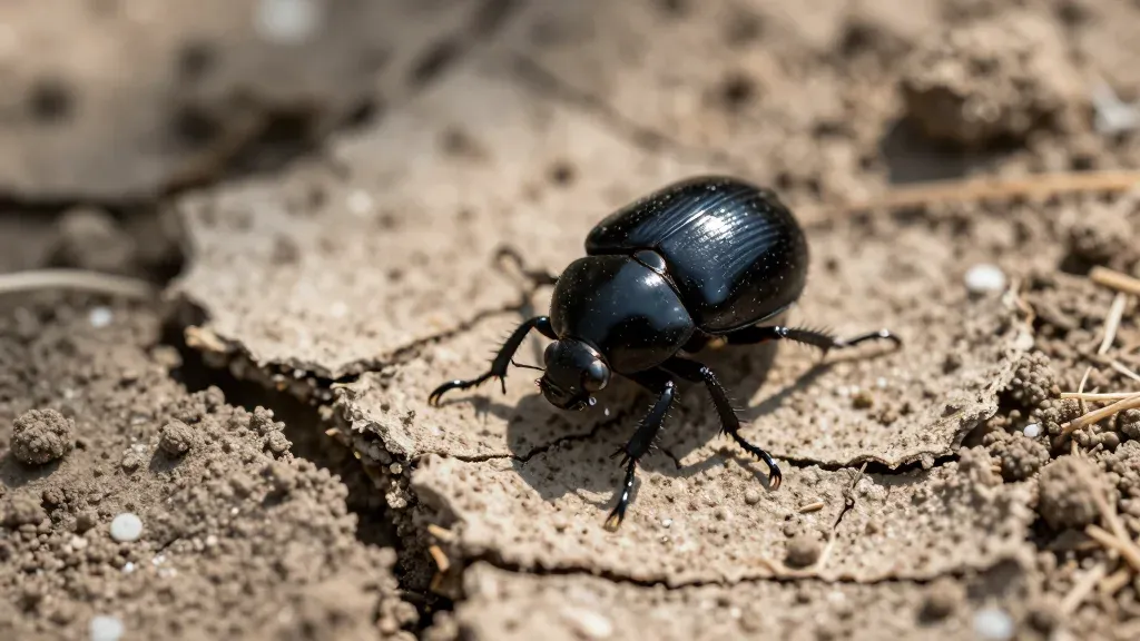 A glossy black beetle crawls across dry, cracked earth under direct sunlight, casting sharp shadows. The close-up, shallow depth of field highlights the beetle's hard shell against the textured, earthy background.