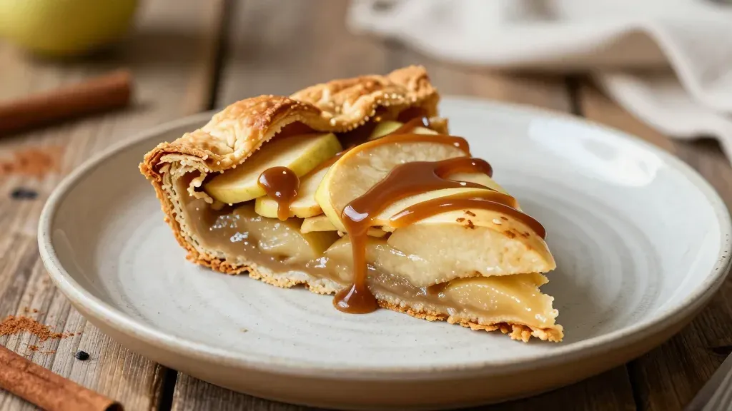 A close-up of a caramel apple galette with a flaky crust and glossy caramel, set against a rustic wooden table. The soft, warm lighting highlights the textures and colors, creating a shallow depth of field that draws attention to the dessert.