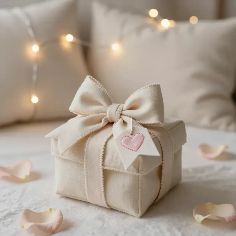 A cream bow gift box adorned with a pink heart tag, surrounded by delicate rose petals, set against a backdrop of warm, golden string lights and white pillows, creating a soft, romantic ambiance. The balanced composition and soft lighting make this image perfect for Valentine's Day or romantic themes.