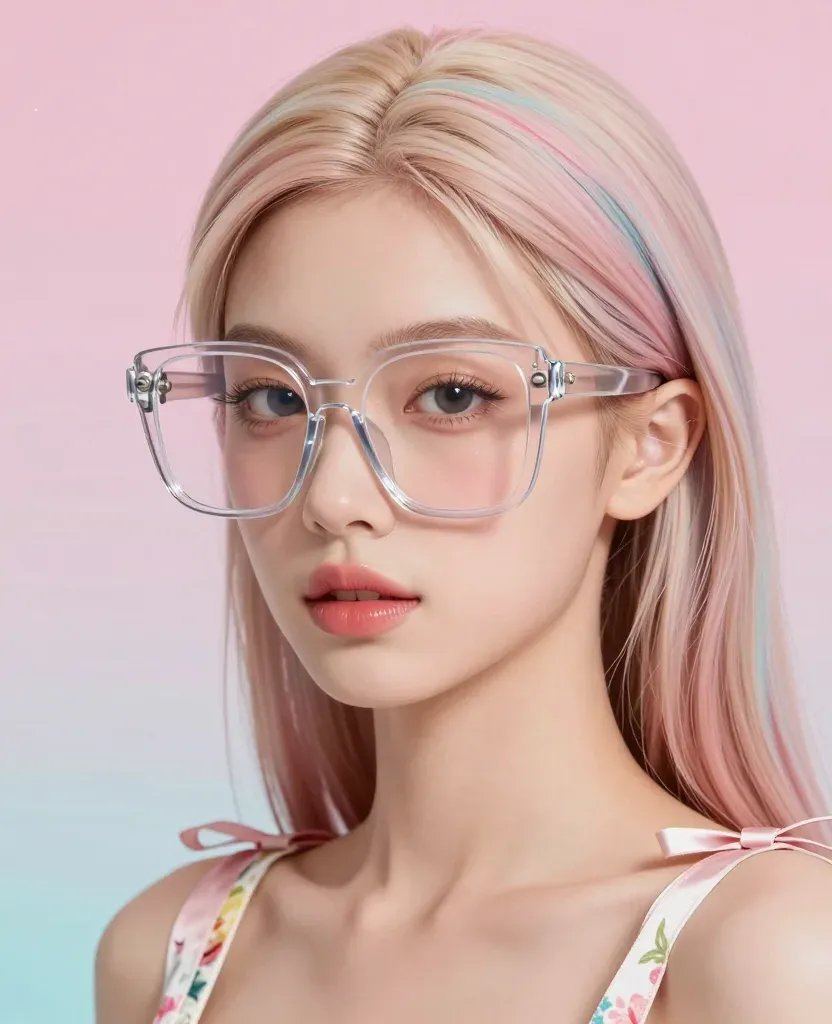 A model with pastel hair and clear glasses exudes a soft, dreamy aesthetic under diffused, soft lighting. The shallow depth of field and dreamy pink background create a romantic and ethereal atmosphere.