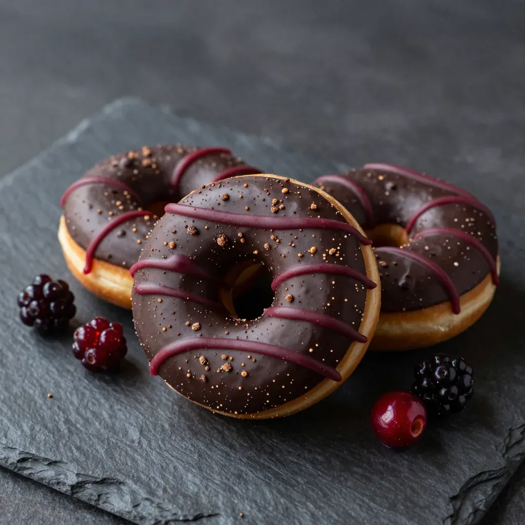 Glossy chocolate-glazed donuts with burgundy berry drizzle and cocoa sprinkles, arranged on a dark slate surface, creating a striking contrast. Soft, diffused lighting highlights the textures and drizzle, while a slight blur in the background keeps the focus on the donuts.