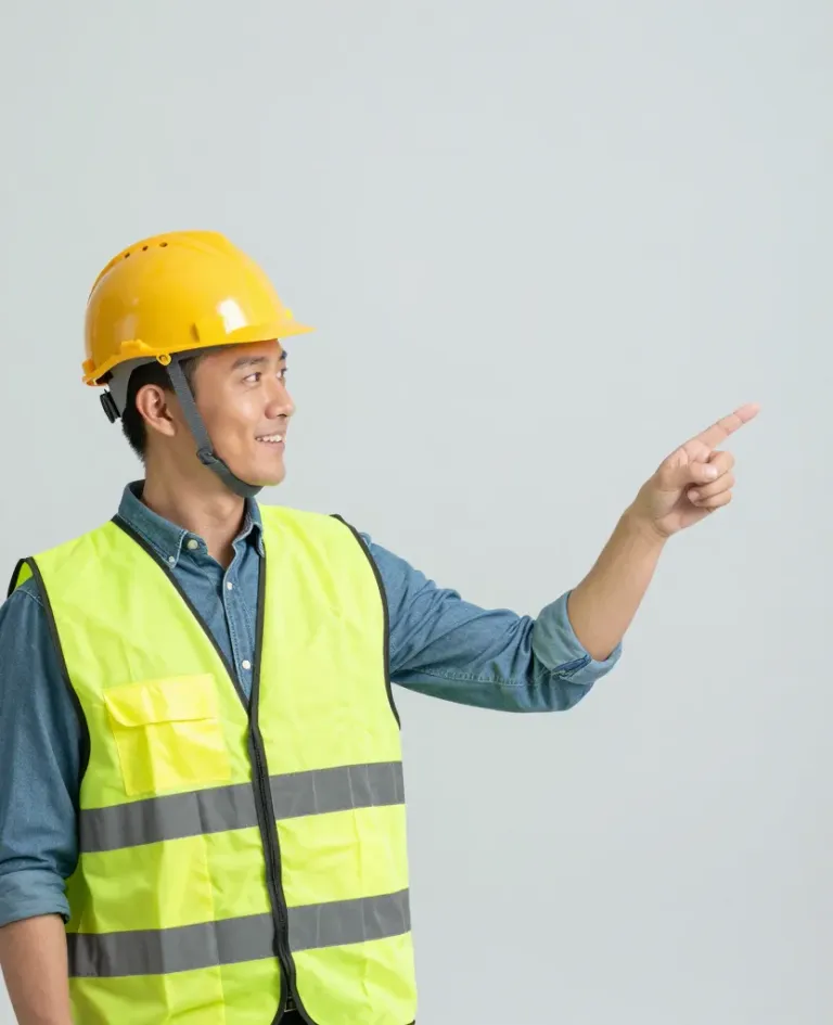 A construction worker in a yellow hardhat and high-visibility vest points to the right, with soft, even lighting highlighting the reflective elements of the vest. The plain, light gray background ensures the focus remains on the subject.