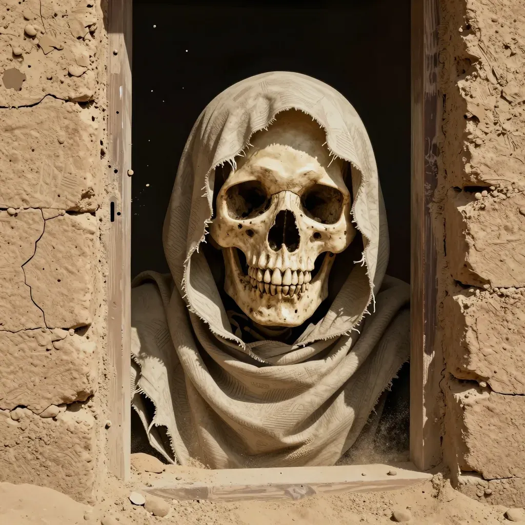 A skeletal figure draped in tattered cloth peers through a weathered stone window, set against a desolate sandy landscape under a starry night sky. The soft ambient light highlights the textures of the cloth and skull, creating a dramatic and eerie composition.