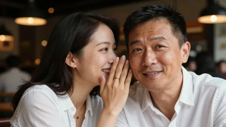A couple shares a private joke in a cozy café, with soft, warm lighting highlighting their intimate interaction. The shallow depth of field draws focus to their expressions, creating a sense of closeness and privacy.
