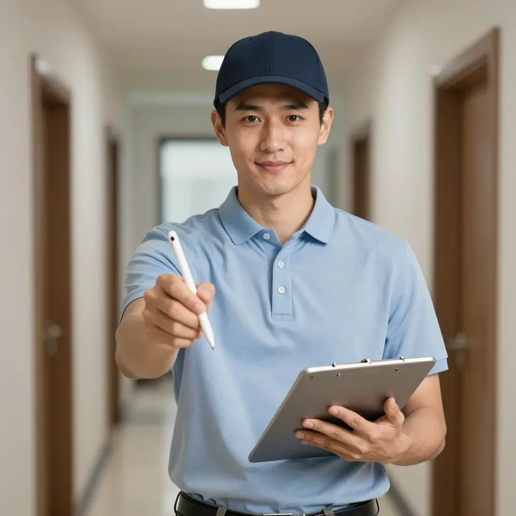 A delivery person in a light blue polo shirt and dark blue cap holds a tablet and stylus, standing in a clean, modern hallway with soft ambient lighting and a shallow depth of field that blurs the background, emphasizing the subject.