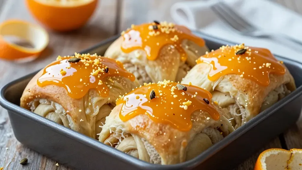 Golden-orange caramel sauce drizzles over flaky orange-cardamom buns, highlighting their soft and tender texture under warm, soft lighting. The close-up shot fills the frame, emphasizing the glossy caramel and flaky layers against a blurred rustic wooden background with scattered orange peels and a white cloth, adding a cozy, homey atmosphere.