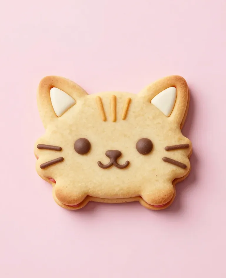 A golden-brown cat-shaped cookie with white ears and whiskers, dark brown eyes and nose, and a soft pink background. The image is well-lit with diffused light, creating gentle shadows and highlights, and the composition is centered with a clean and simple backdrop.