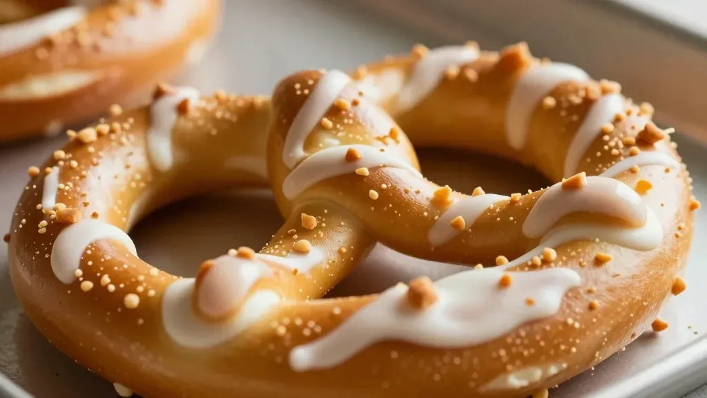 Golden-brown pretzels are drizzled with glossy white icing and sprinkled with coarse sugar, creating a visually appealing contrast. The soft, diffused lighting highlights the textures and colors, while the shallow depth of field keeps the pretzels sharply in focus against a blurred background.