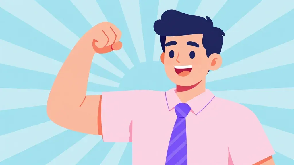 A cheerful businessman flexes his biceps in a soft, glossy pink shirt against a smooth, sunburst-patterned background. The bright, even lighting highlights the subject's muscular definition and the vibrant color palette of pink, purple, and blue.
