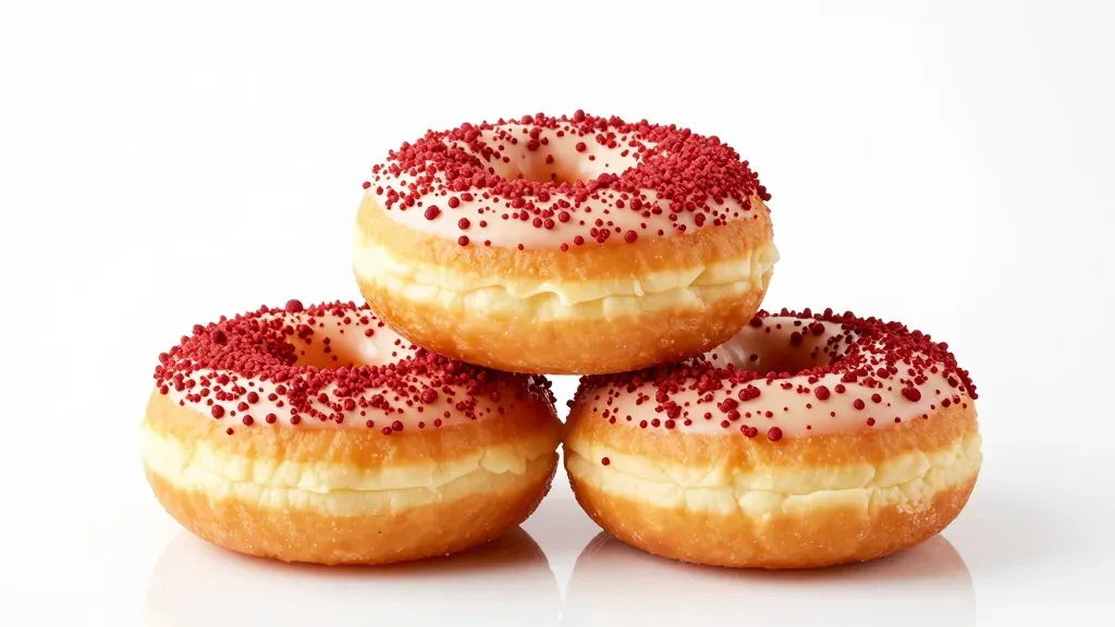 A stack of golden-brown donuts with white glaze and crunchy red sprinkles, illuminated by bright, even lighting that highlights the glossy texture and casts soft shadows, creating a visually appealing and appetizing composition against a pure white background.