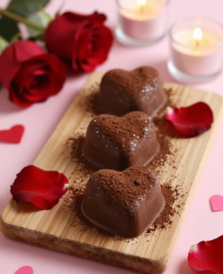 Heart-shaped chocolate truffles with a glossy finish and cocoa powder sprinkling, set on a wooden board with rose petals and lit candles, creating a warm, romantic ambiance. The soft, ambient lighting and shallow depth of field enhance the intimate and luxurious feel of the scene.