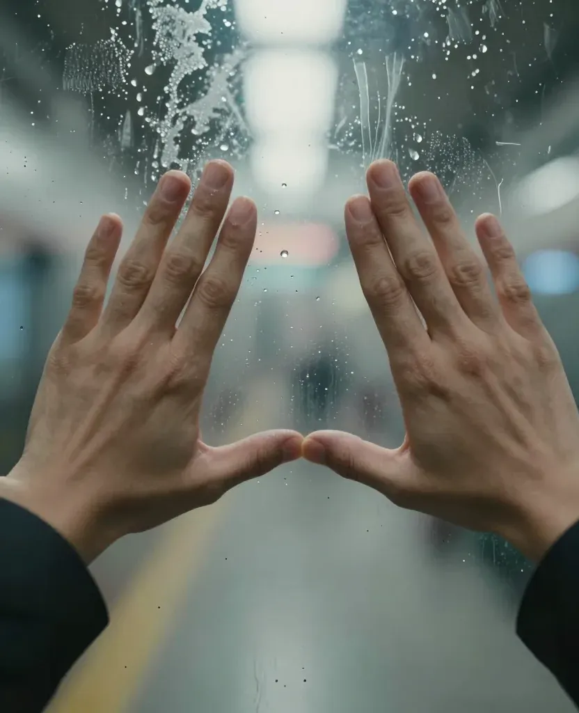 Two hands form a heart shape, pressing against a misty glass window, creating a tender and intimate scene. The diffused light and soft glow highlight the hands and glass, while the blurred background suggests a train station setting, adding depth and context.