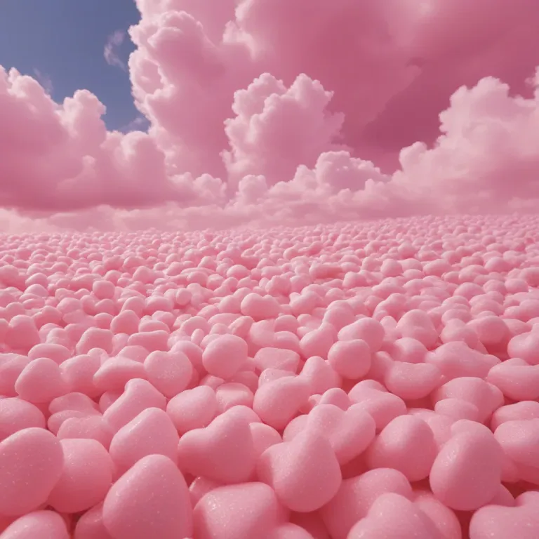 A wide-angle shot of heart-shaped candies with a soft, glossy texture, set against a diffused, ethereal pink sky filled with fluffy, cotton-like clouds. The shallow depth of field creates a dreamy, surreal atmosphere, ideal for use in creative and whimsical designs.