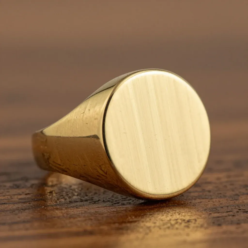 A close-up of an engraved gold signet ring with intricate details, softly lit to highlight its texture and engravings, set against a blurred wooden surface that enhances the ring's prominence.