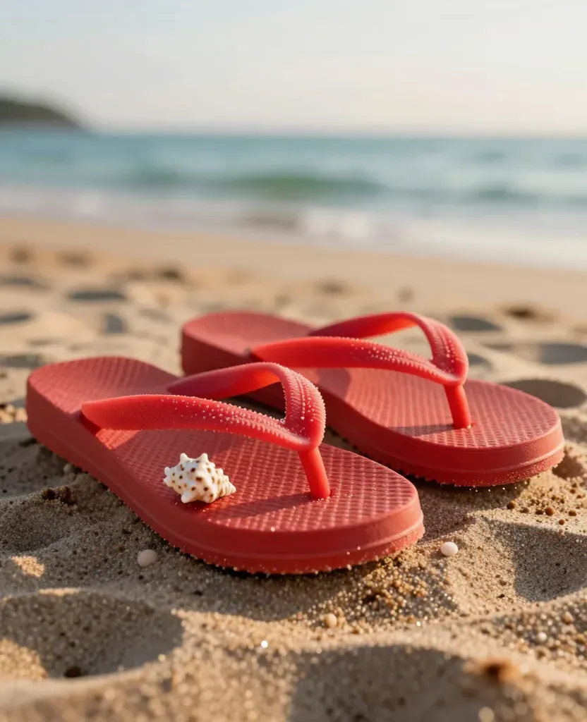 Glossy red flip-flops with a seashell rest on textured sand under golden sunlight, creating a serene beach scene with a shallow depth of field.
