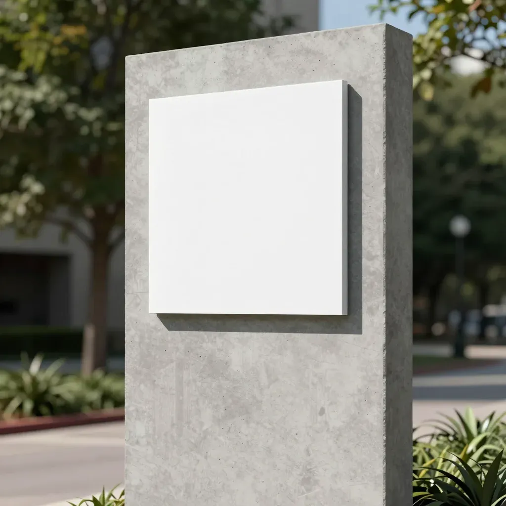 A rough concrete monolith sign with a smooth white plaque stands prominently in a blurred urban park setting, bathed in natural sunlight that creates sharp shadows and highlights. The balanced composition and copy space make it ideal for text overlay or branding.