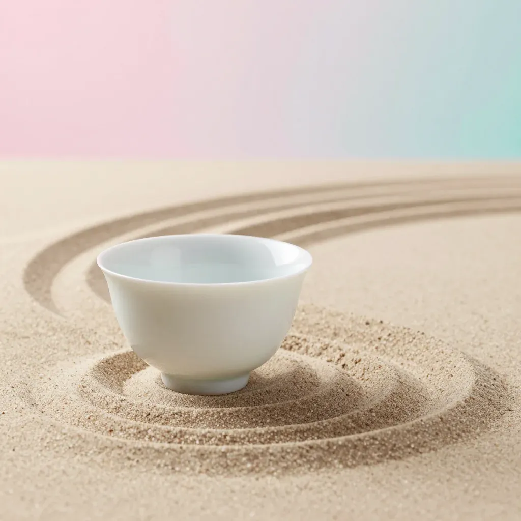 A glossy white porcelain teacup sits centered in a meticulously raked sand garden, with soft diffused lighting creating gentle shadows and highlights. The shallow depth of field and pastel background enhance the serene and minimalist aesthetic of the composition.