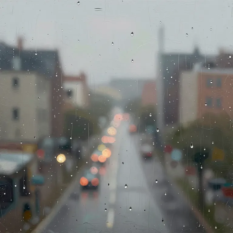 Raindrops glisten on a window, obscuring a soft, blurred cityscape with glowing streetlights. The diffused, ambient light creates a hazy, atmospheric effect, ideal for evoking a sense of calm and introspection.