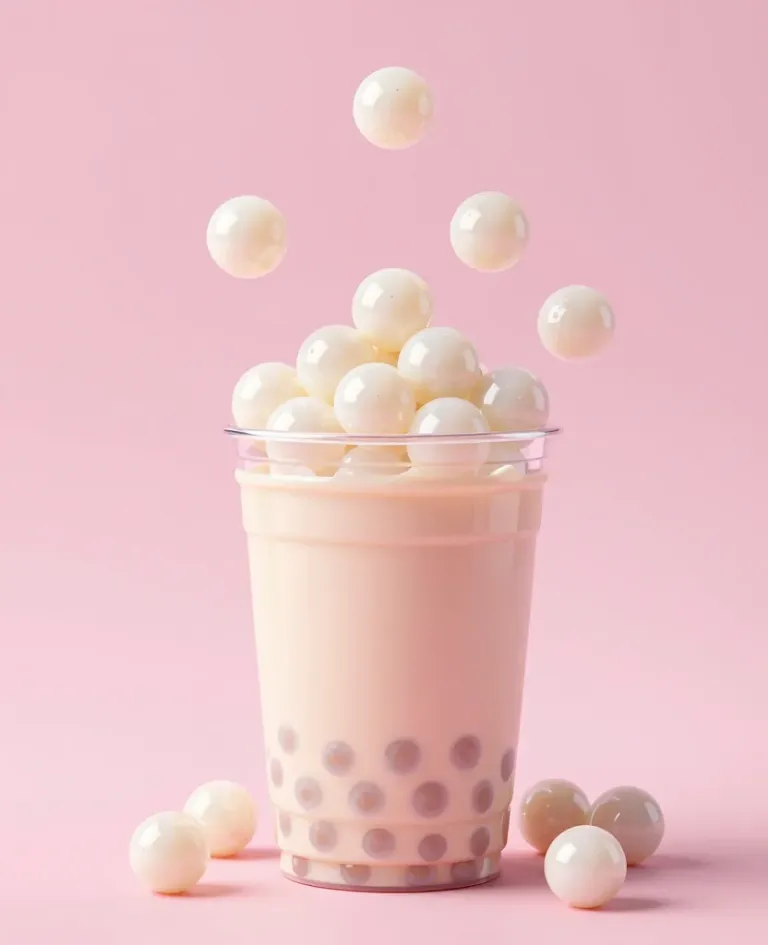 A clear plastic cup filled with creamy pink milk tea is topped with white tapioca pearls suspended mid-air, with additional pearls scattered around the base, showcasing a glossy sheen on the pearls and a smooth, viscous texture in the drink. Soft, diffused front-side lighting creates subtle highlights on the pearls and cup rim, with a shallow depth of field emphasizing the floating pearls against a clean, uniform pastel pink background.