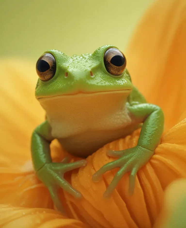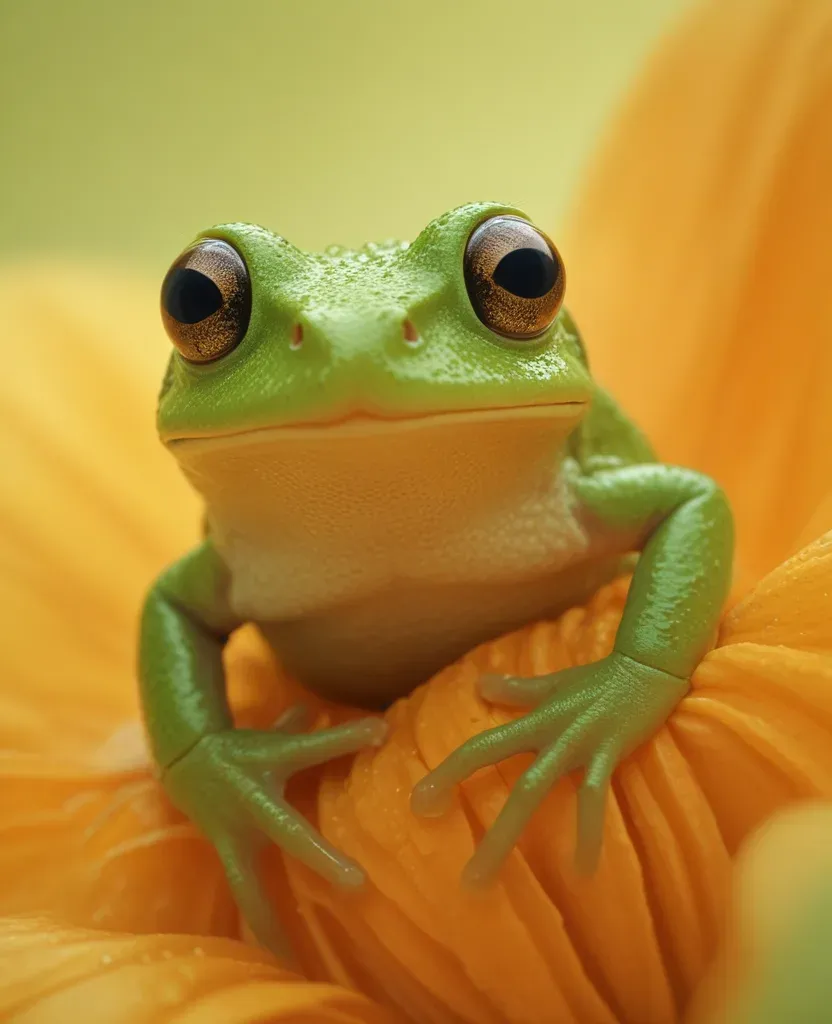 A close-up of a glossy green frog with large amber eyes, perched on soft, slightly curled sunflower petals. The soft, diffused light highlights the frog's skin and the delicate texture of the petals, creating a shallow depth of field that keeps the focus on the subject.