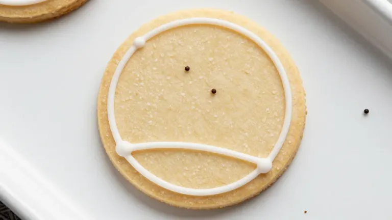 A close-up of a sugar cookie with white icing lines, showcasing smooth, glossy icing and golden brown texture under direct overhead light. The shallow depth of field and clean white background provide a crisp, focused view ideal for food and dessert imagery.