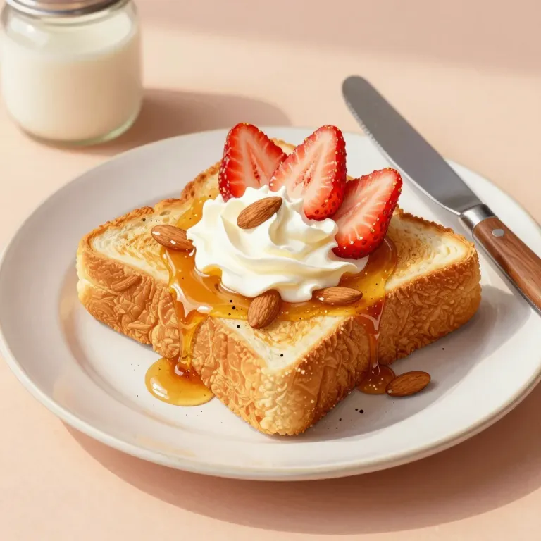 A golden toast slice topped with creamy whipped cream, glossy honey, crunchy almonds, and juicy strawberries, bathed in soft natural light that highlights the textures and vibrant colors. The balanced composition and neutral background ensure the toast remains the focal point.