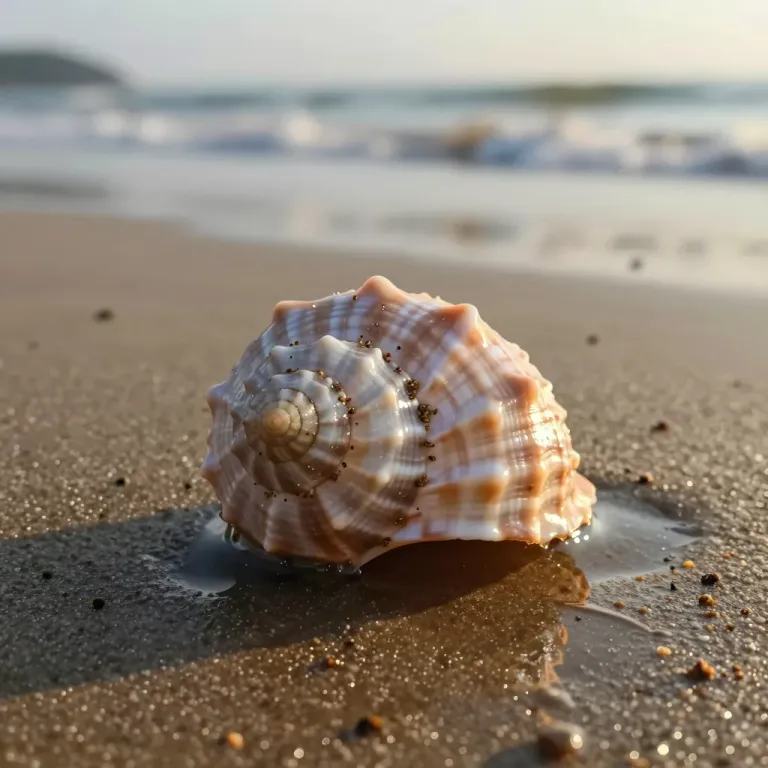 A close-up of a glossy seashell with intricate ridges and spirals, resting on wet sand, bathed in warm, golden light from the setting sun. The blurred ocean waves in the background create a sense of depth and tranquility.
