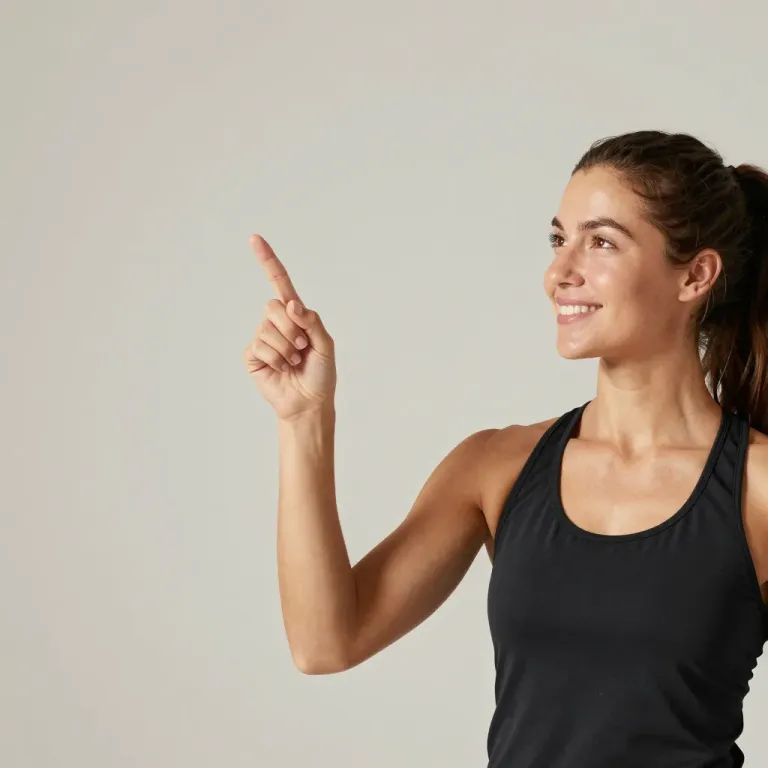 A woman in a dark athletic tank top points upwards with a soft, even light highlighting her smooth skin and glossy fabric. The neutral background and slight tilt to the right create a balanced and focused composition.