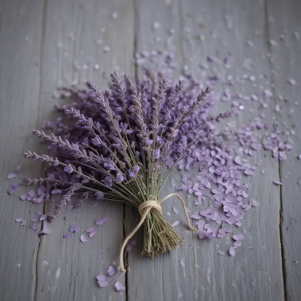 A soft lavender bundle tied with string rests on a weathered wooden surface, bathed in soft, diffused light that creates gentle shadows. The shallow depth of field draws attention to the delicate texture of the dried lavender and the rustic charm of the wooden background.