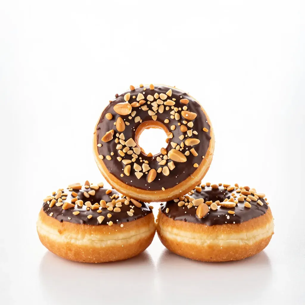 A glossy chocolate-glazed donut with crunchy peanuts is stacked on top of two others, creating a pyramid. Soft, diffused lighting highlights the texture and color, emphasizing the glossy chocolate and the golden brown donut base, while the clean white background ensures the focus remains on the donuts.