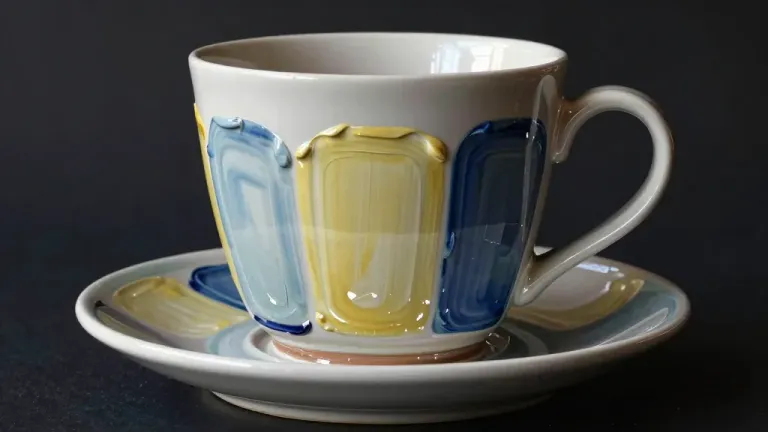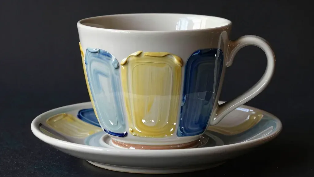 A close-up of a glossy ceramic coffee cup and saucer with vibrant blue and yellow swirls, softly lit to highlight the glossy surface and reflections. The dark, neutral background ensures the focus remains on the cup and saucer, providing ample copy space for design elements.
