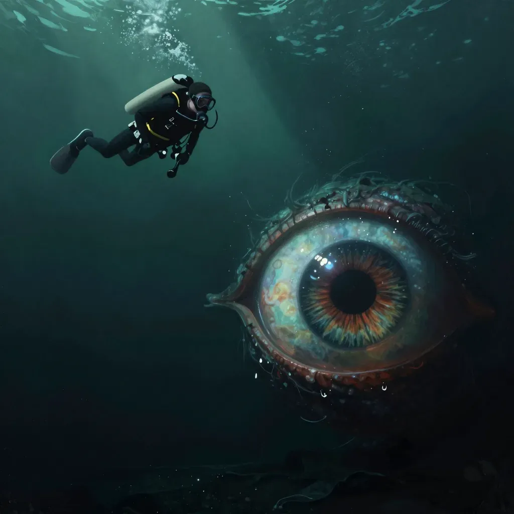 A diver explores a mysterious trench dominated by a colossal, multi-colored eye with a rough, textured shell. Ethereal sunlight filters through the murky water, highlighting the intricate details and vibrant colors of the eye, creating a sense of depth and scale.